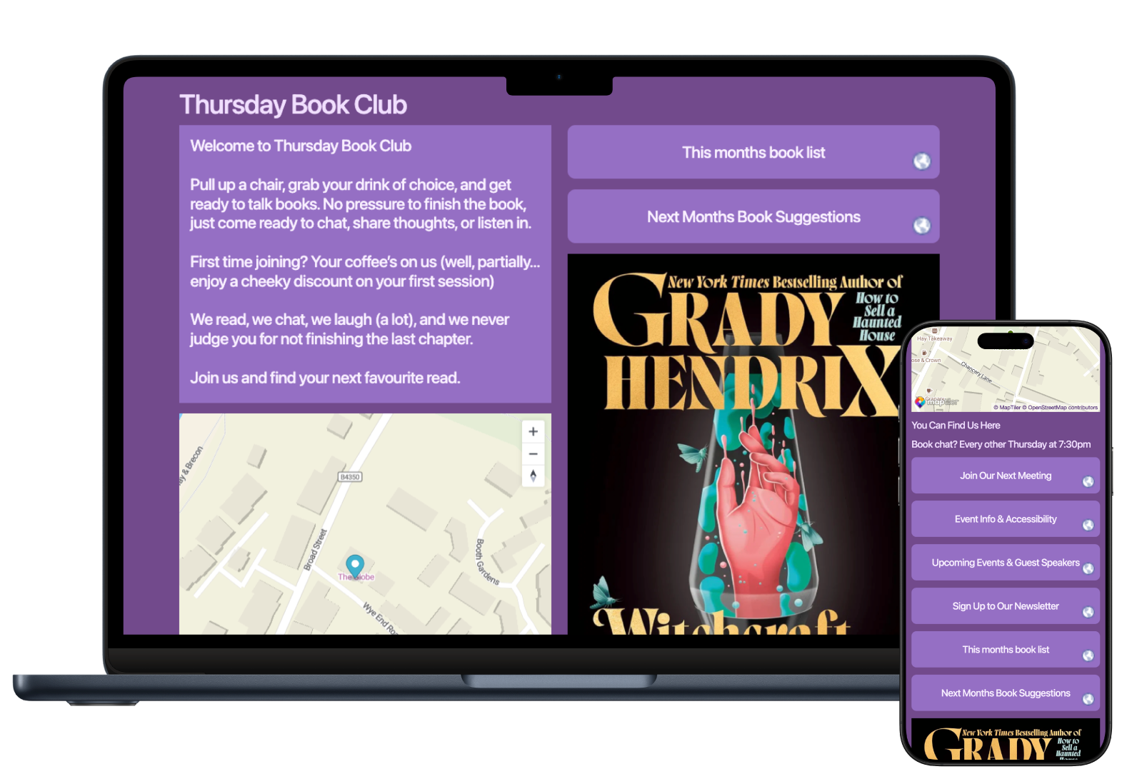 Create your events, add locations, drop a pin on a map, set the times, make them repeat every week. Then gather responses of who is coming, who they're bringing, or limit the numbers you allow.