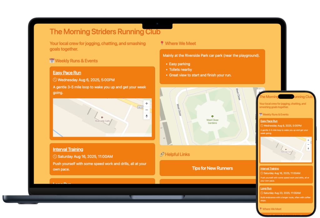 Keep your club or group up to date with a private group space that reflects who you are. Add text, links, events, images and more in just a few clicks.