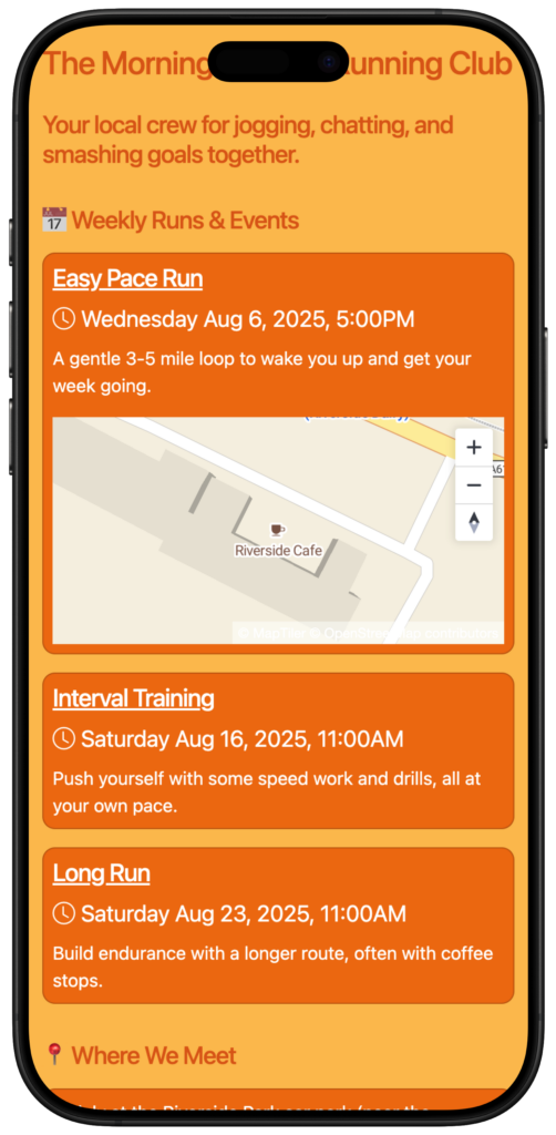Share exactly where your regular venue is or share individual event locations using map pins and addresses. Nobody gets lost.