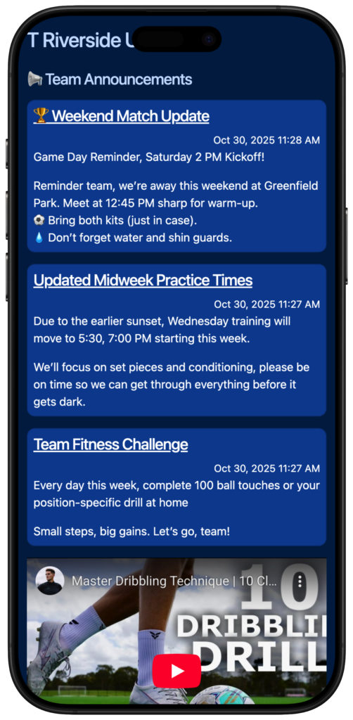 Use Boards to share match schedules, training sessions and more. Use Links, Text, Images, YouTube embeds and more.